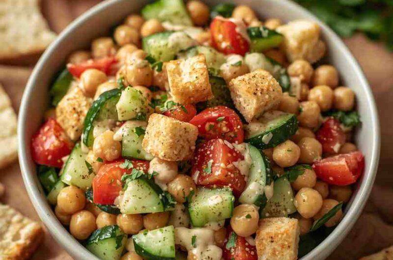 This Middle Eastern Chickpea Salad with Tahini Dressing is a vibrant, hearty, and flavor-packed dish that beautifully captures the essence of Mediterranean cuisine. Every bite is a harmony of creamy chickpeas, crisp cucumbers, juicy tomatoes, fresh herbs, and a luxuriously silky lemon-tahini dressing that ties it all together.