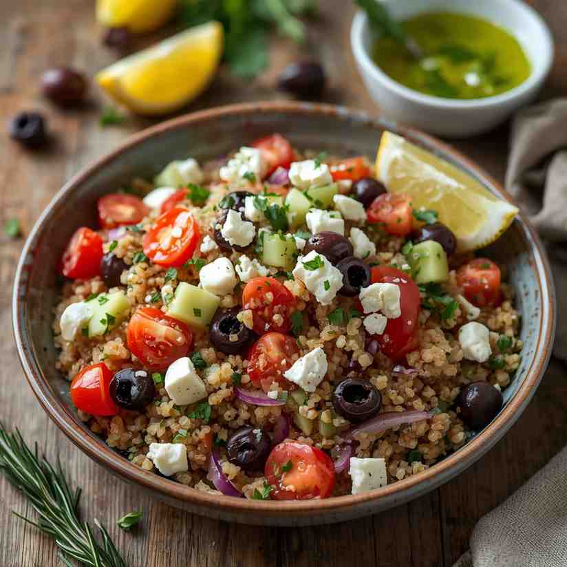 The Quinoa Greek Salad with Lemon Vinaigrette is a vibrant, nutritious, and satisfying salad that blends the wholesome goodness of quinoa with the classic flavors of a Greek salad. Crisp cucumbers, juicy tomatoes, sweet red onion, Kalamata olives, and creamy feta cheese are combined with fluffy, protein-rich quinoa and tossed in a bright, zesty lemon vinaigrette.