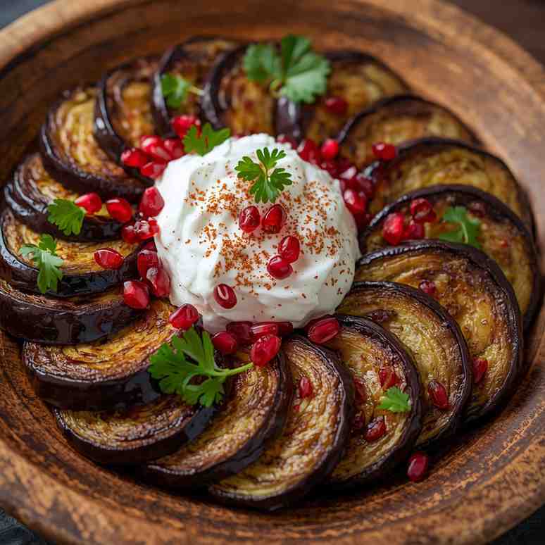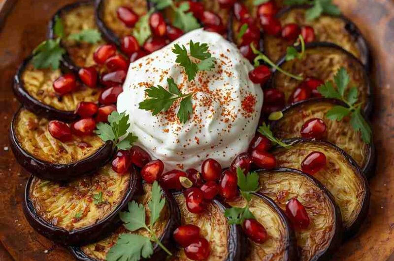 Roasted Eggplant Salad with Yogurt and Pomegranate is a dish that perfectly balances smoky, creamy, and tangy flavors in one elegant presentation. Earthy roasted eggplants meet a cool, garlicky yogurt dressing and are finished with bursts of juicy pomegranate seeds for sweetness and crunch. Each bite is a delightful play of textures — velvety eggplant, smooth yogurt, and crisp pomegranate jewels.