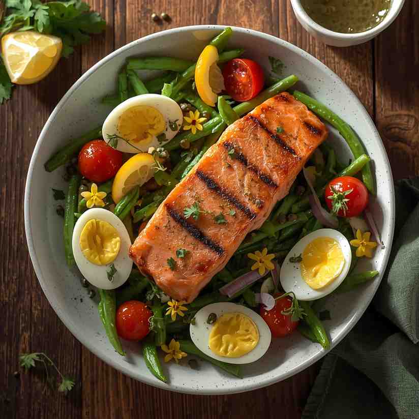 I love this recipe because it combines elegance with everyday practicality. Salmon pairs beautifully with the traditional Nicoise elements—eggs, green beans, olives, and potatoes—creating layers of flavor, color, and wholesome nutrition. Each bite feels thoughtfully composed, yet the recipe remains incredibly simple to prepare.