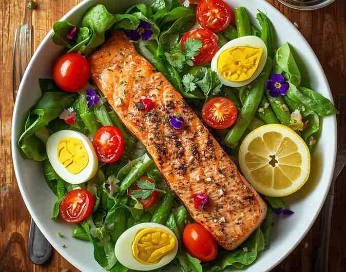 - A balanced meal with protein, healthy fats, and fresh vegetables