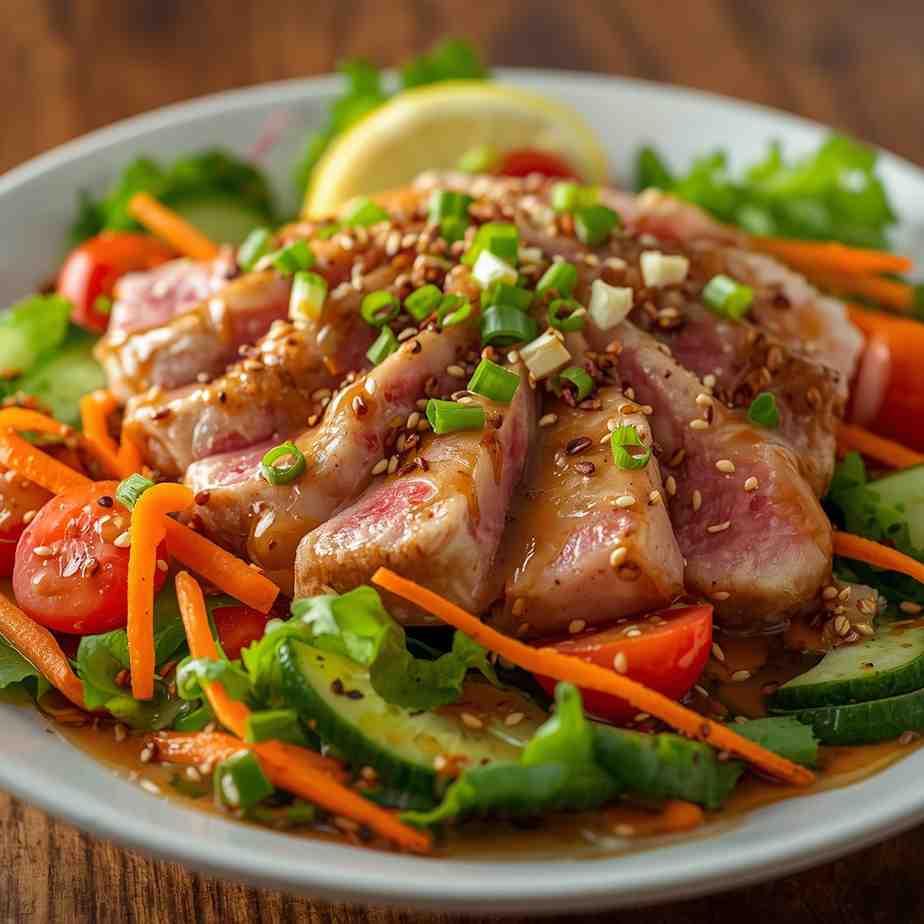 Seared Tuna Salad with Soy Ginger Dressing is a refreshing, vibrant, and protein-packed dish that combines tender, perfectly seared tuna with crisp vegetables and a bold, aromatic dressing. Inspired by Asian flavors, this salad balances the richness of tuna with bright ingredients such as cucumber, radish, mixed greens, and sesame. The Soy Ginger Dressing adds a zesty combination of sweetness, saltiness, and warmth that pairs beautifully with the delicate sear of the tuna.