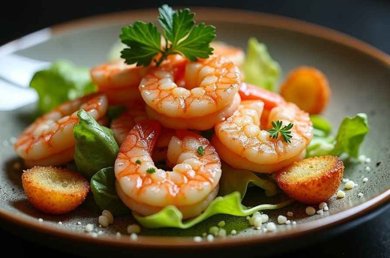 Prepare crispy croutons by toasting bread cubes until golden. Season and quickly sauté the shrimp until just cooked. Toss romaine lettuce with Caesar dressing, top with shrimp, croutons, and Parmesan, then serve immediately.