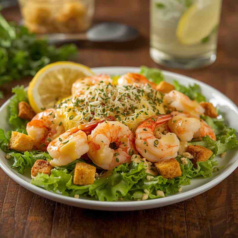 - Plate and Serve: Arrange shrimp on top, drizzle extra dressing, garnish with Parmesan.