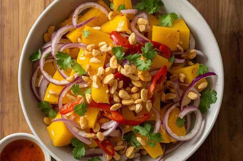 Thai Mango Salad with Chili Lime Dressing is a vibrant, refreshing, and flavor-packed dish that perfectly balances sweet, tangy, and spicy notes. This salad features ripe, juicy mangoes paired with crisp vegetables like red bell pepper, carrot, and cucumber, all tossed in a zesty chili-lime dressing. Garnished with fresh herbs and crunchy peanuts, it’s a symphony of flavors and textures in every bite.