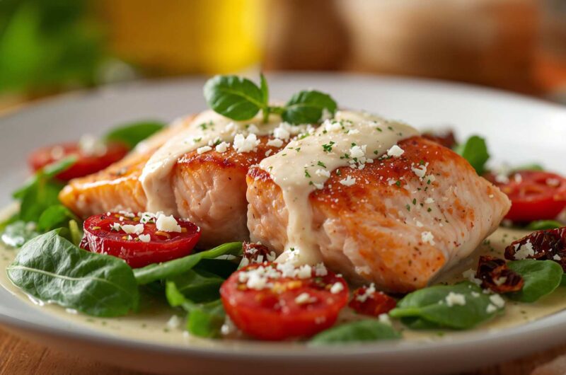 Creamy Tuscan Salmon is a luxurious, restaurant-style dish that brings the flavors of Italy right to your home kitchen. Tender salmon fillets are pan-seared to golden perfection and served in a rich, creamy garlic sauce with sun-dried tomatoes, fresh spinach, and a hint of Italian herbs. The sauce clings beautifully to the salmon, creating a decadent yet wholesome meal that’s packed with flavor.