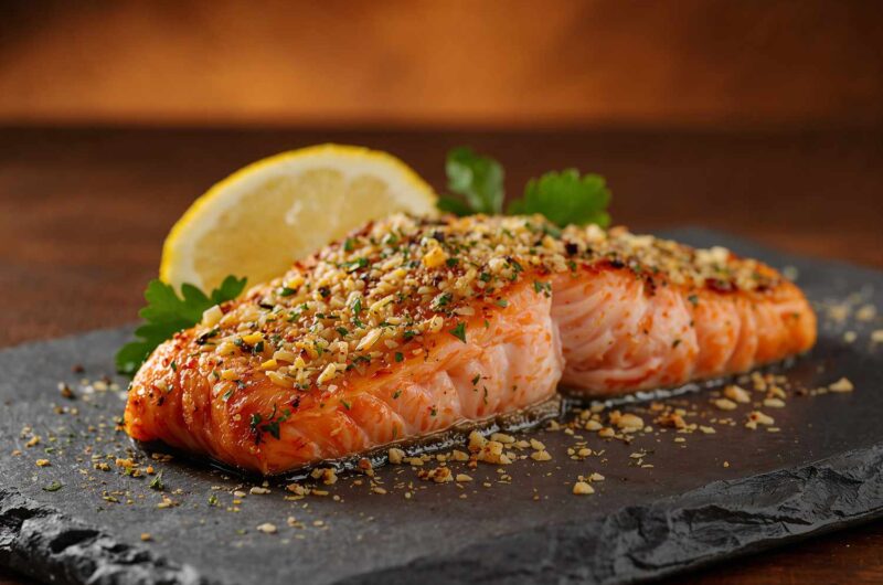 Garlic Parmesan Crusted Salmon is a decadent and elegant dish that combines the richness of fresh salmon with a crunchy, golden Parmesan-garlic topping. Each fillet is coated with a mixture of garlic, Parmesan, herbs, and breadcrumbs, then baked or broiled to achieve a crisp, flavorful crust. The result is a salmon that is tender and flaky on the inside with a savory, crunchy exterior that elevates the entire dining experience.