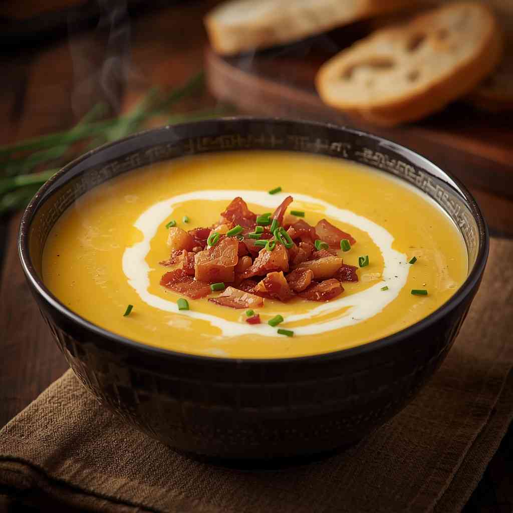 - Step 7: Serve : Ladle the soup into bowls. Top with extra bacon, shredded cheddar, and a sprinkle of fresh chives. Serve hot with crusty bread or garlic toast on the side.