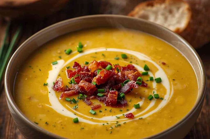The soup’s texture is wonderfully thick and silky, while the crispy bacon bits add a satisfying crunch and smoky depth. Chives bring in a subtle oniony brightness that cuts through the creaminess, making every spoonful irresistible. Whether served for a cozy lunch or a family dinner on a chilly night, this soup delivers pure comfort in every bite.