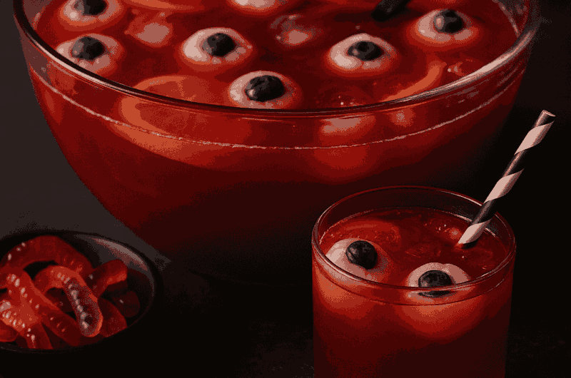 What’s more, kids and adults alike can enjoy this drink—kids will love the fun presentation, while adults can spike their glasses with vodka, rum, or red wine for a scarier kick. Plus, garnishes like floating “eyeballs” (lychees with blueberries), dry ice fog, or gummy worms turn this punch into a party centerpiece that doubles as decoration.