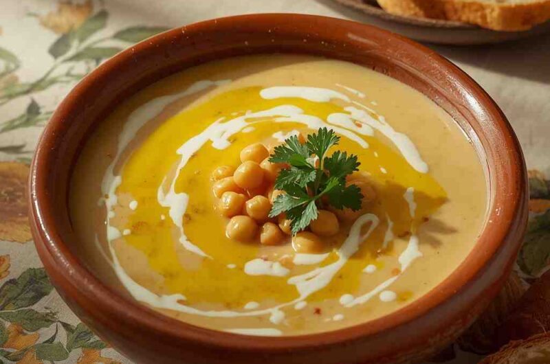 The soup is naturally vegan, gluten-free, and packed with protein and fiber. What makes it so special is the combination of tender chickpeas, aromatic herbs, and bright, tangy lemon juice. Despite its simplicity, it delivers layers of flavor and a creamy texture without any dairy. Each spoonful is heartwarming, vibrant, and deeply satisfying—a perfect reflection of Mediterranean cooking at its best.