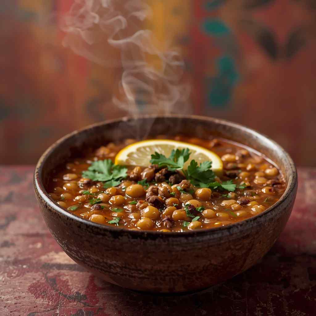 - Step 4: Add Chickpeas and Optional Meat : Add cooked chickpeas and cubed meat (if using). Continue simmering for another 20–30 minutes until the lentils are tender and the broth thickens.