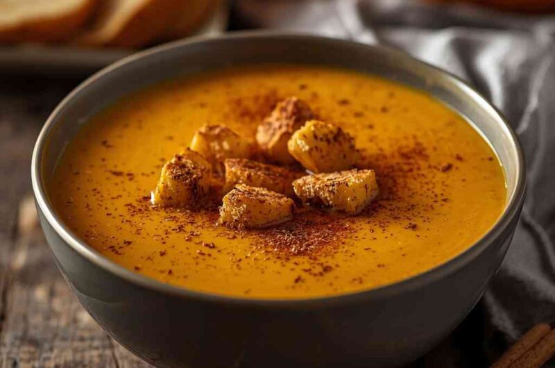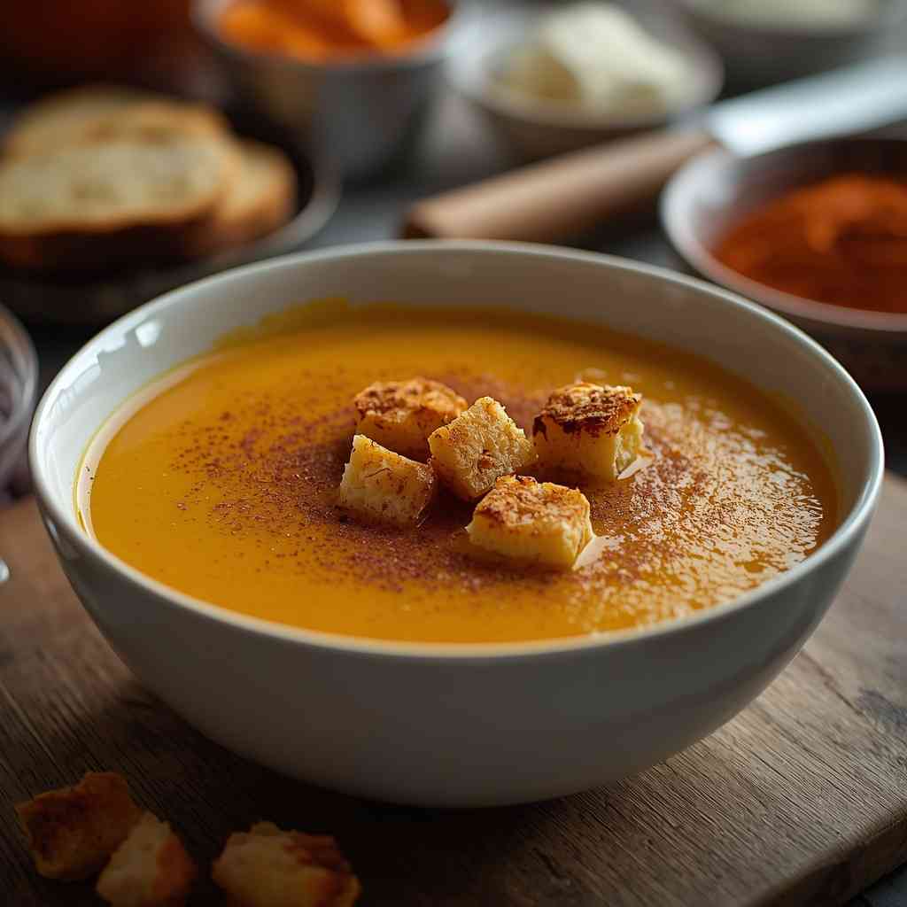 Made with roasted pumpkin or canned pumpkin puree, a touch of cream, and carefully balanced spices like nutmeg, cinnamon, and a hint of smoked paprika, this soup is creamy, savory, and lightly sweet. The spiced croutons provide a contrast in texture and a subtle warmth from seasonings such as garlic, paprika, and thyme.