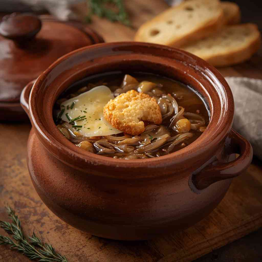 - Step 5: Assemble & Broil : Ladle hot soup into oven-safe bowls. Place one or two toasted baguette slices on top of each bowl. Sprinkle generously with Gruyère and Parmesan cheese. Place bowls on a baking sheet and broil for 2–4 minutes, until the cheese is melted and bubbly with golden edges.