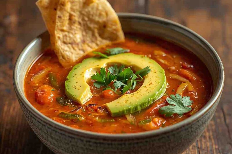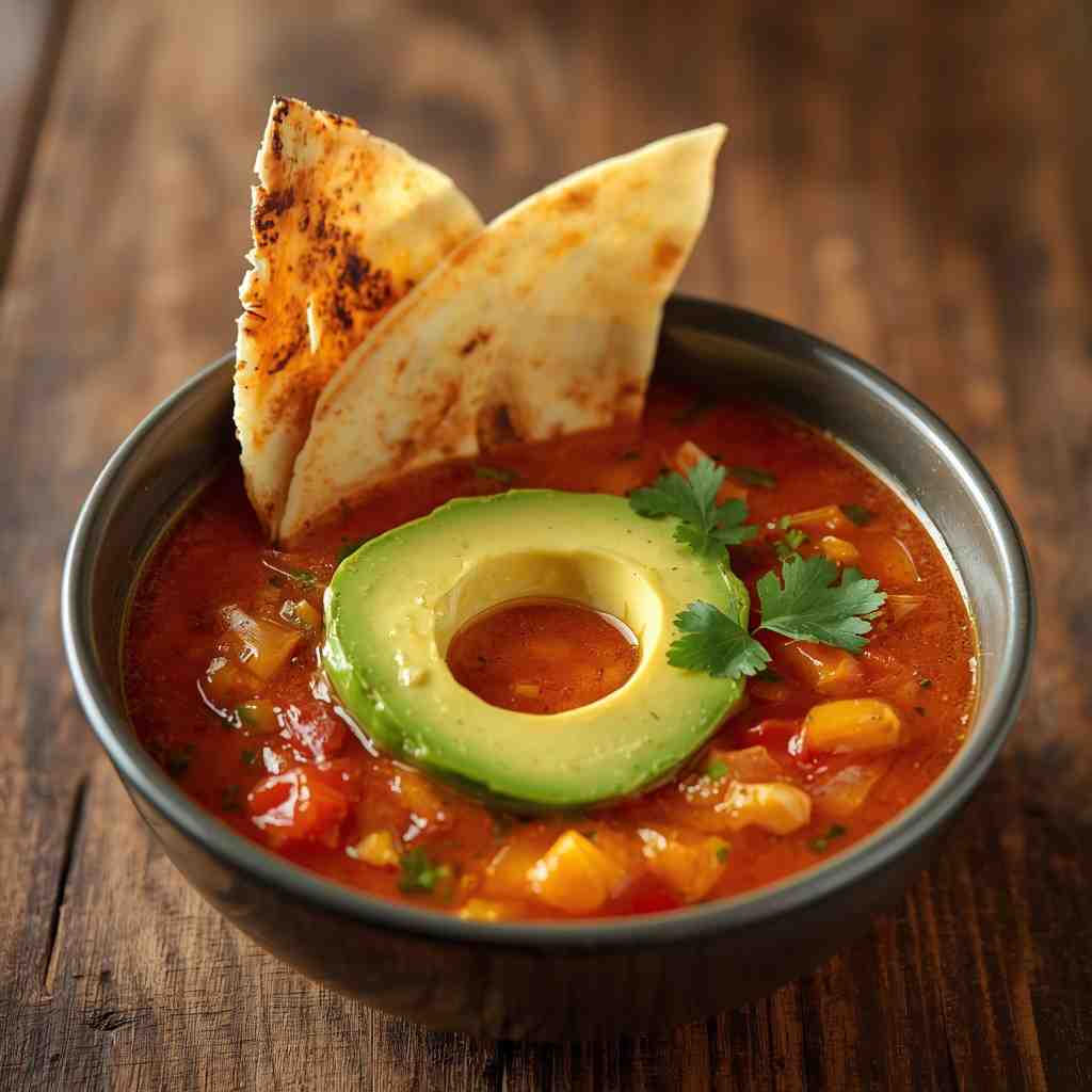 Spicy Tomato Tortilla Soup with Avocado is a bold, vibrant, and deeply satisfying dish that perfectly captures the heart of Mexican comfort food. It combines the smoky heat of chilies, the tanginess of ripe tomatoes, and the crunch of crispy tortilla strips — all topped with creamy slices of fresh avocado. Every spoonful delivers a balance of spice, texture, and freshness that wakes up your taste buds and warms your soul.