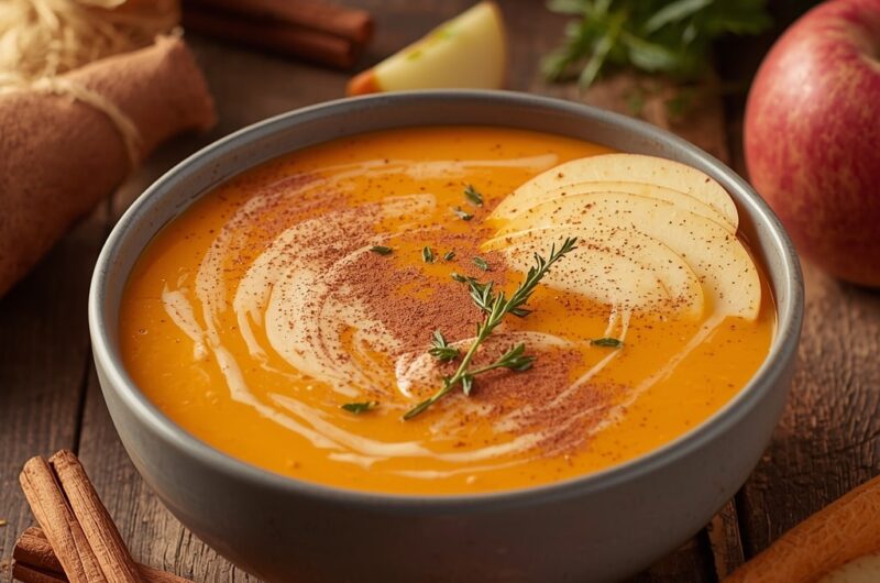 Sweet Potato and Apple Soup with Cinnamon is the perfect blend of comforting warmth and seasonal sweetness. It’s a velvety, nourishing soup that captures the essence of autumn in every spoonful. The natural creaminess of sweet potatoes pairs beautifully with tart, crisp apples — and the aroma of cinnamon makes your kitchen smell like a cozy holiday.