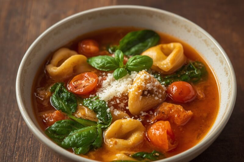 The combination of pasta, vegetables, and aromatic herbs makes this dish both cozy and refreshing. It’s a soup that feels indulgent thanks to the cheesy tortellini while staying balanced and wholesome with fresh spinach and tomatoes.