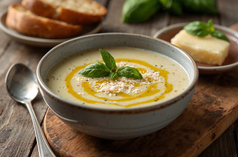 - Serve hot, garnished with extra Parmesan, basil leaves, croutons, or a drizzle of olive oil or cream.